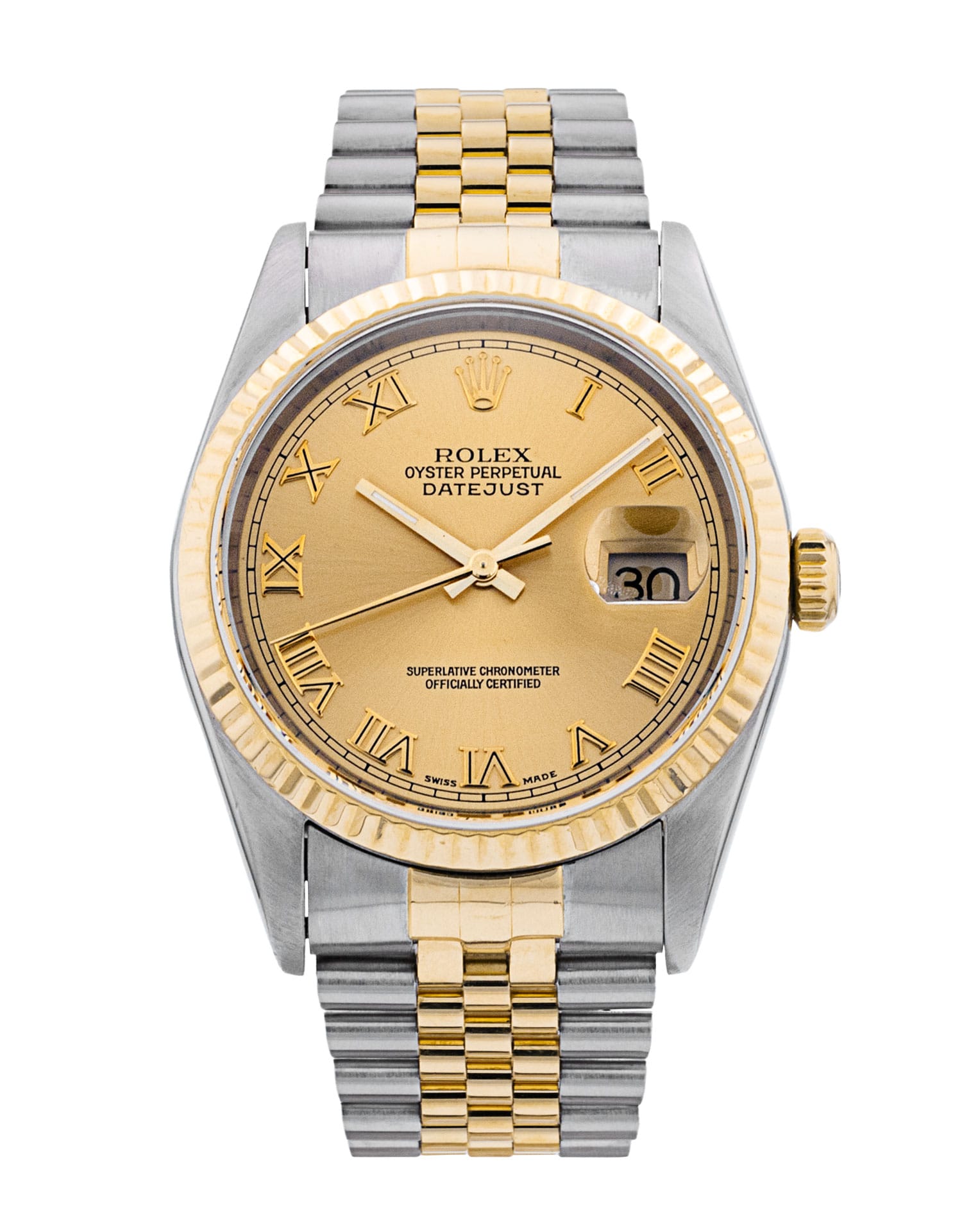 This Rolex Datejust 16233 has a champagne roman numeral dial and a bracelet strap. This Rolex has undergone a thorough inspection of water resistance, accuracy, functionality and condition to determine the level of reconditioning required to meet our strict standards. It has also been referenced against technical documents and manufacturer records where available to ensure authenticity and a clean history. All our watches have a 24-month warranty for your peace of mind. One of our skilled polishing technicians has removed marks on the case and bracelet of this watch, brought about by daily wear and tear, which is why this watch does not come with the remaining manufacturer’s warranty.