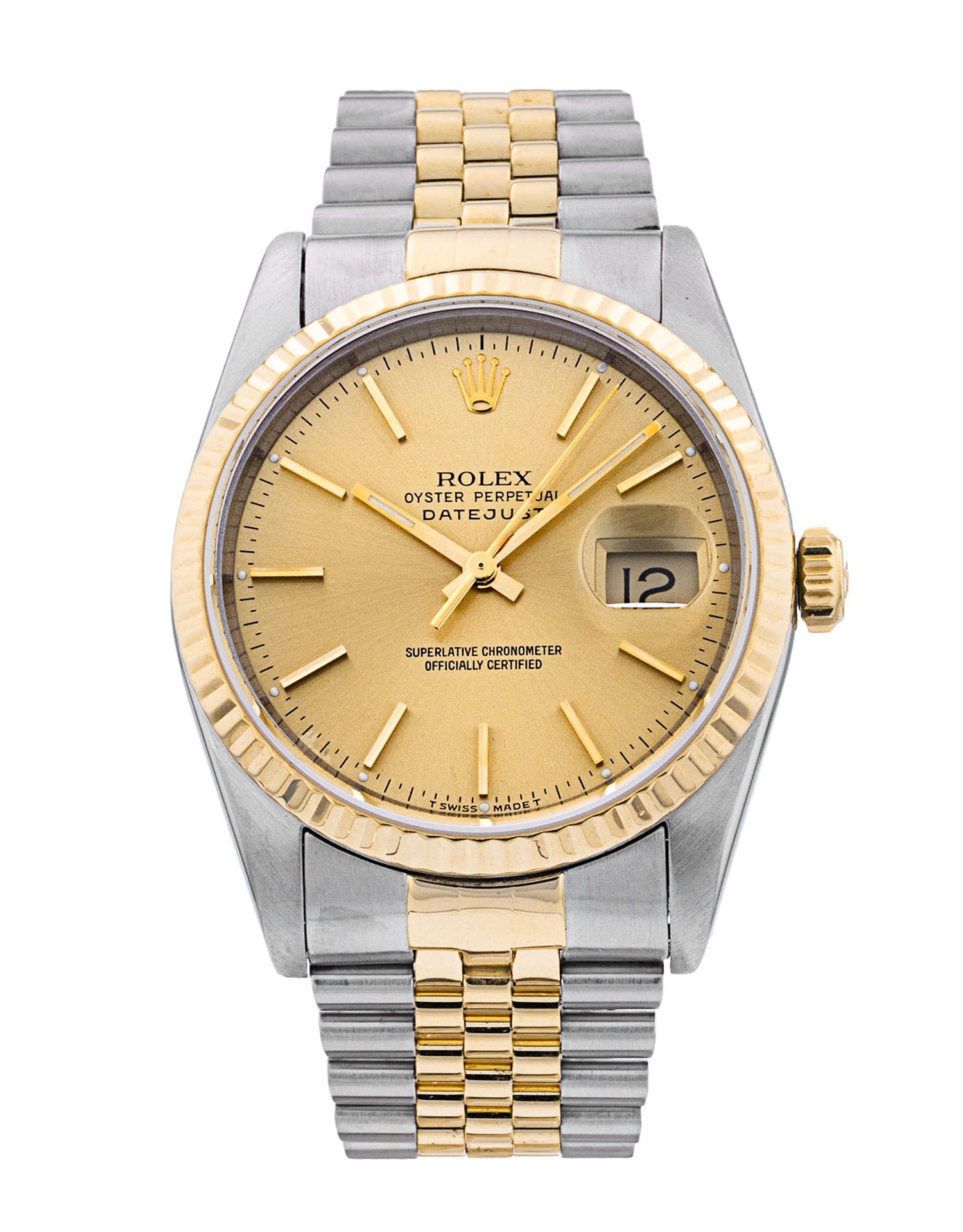 This Rolex Datejust 16233 has a champagne baton dial and a bracelet strap. This Rolex has undergone a thorough inspection of water resistance, accuracy, functionality and condition to determine the level of reconditioning required to meet our strict standards. It has also been referenced against technical documents and manufacturer records where available to ensure authenticity and a clean history. All our watches have a 24-month warranty for your peace of mind. One of our skilled polishing technicians has removed marks on the case and bracelet of this watch, brought about by daily wear and tear, which is why this watch does not come with the remaining manufacturer’s warranty.