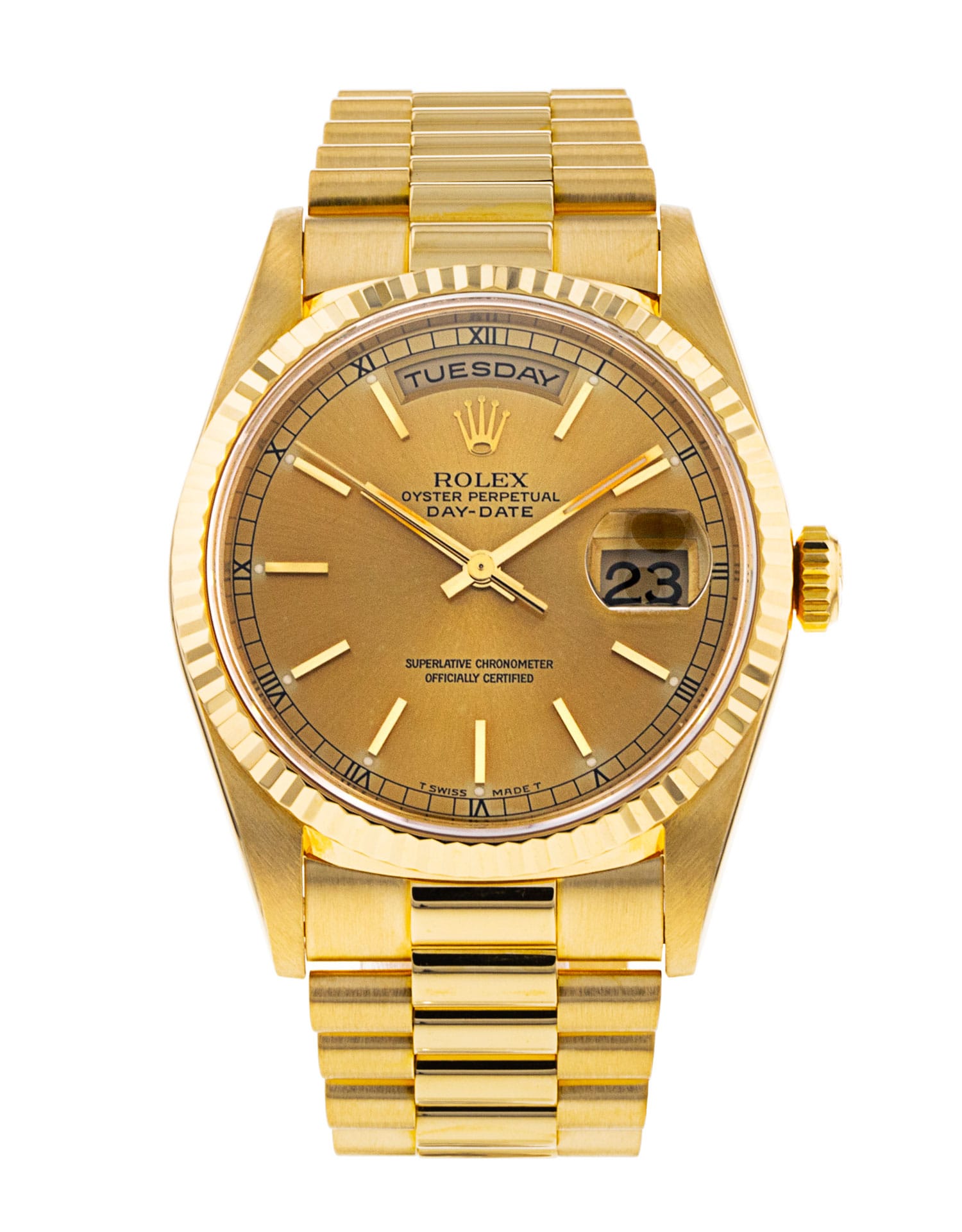 This Rolex Day-Date 18038 has a champagne baton dial and a bracelet strap. This Rolex has undergone a thorough inspection of water resistance, accuracy, functionality and condition to determine the level of reconditioning required to meet our strict standards. It has also been referenced against technical documents and manufacturer records where available to ensure authenticity and a clean history. All our watches have a 24-month warranty for your peace of mind. One of our skilled polishing technicians has removed marks on the case and bracelet of this watch, brought about by daily wear and tear, which is why this watch does not come with the remaining manufacturer’s warranty.