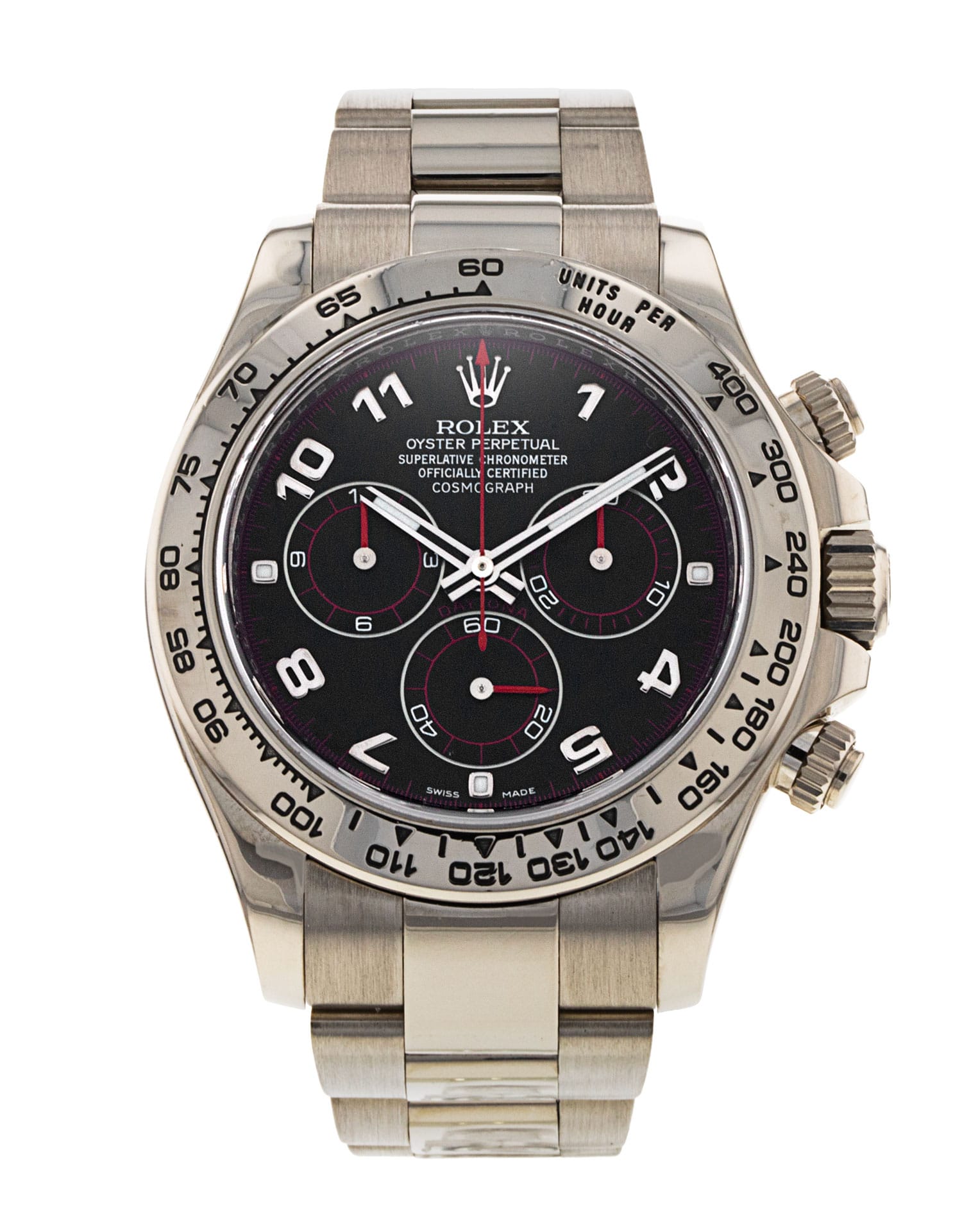 This Rolex Daytona 116509 has a black arabic dial and a bracelet strap. This Rolex has undergone a thorough inspection of water resistance, accuracy, functionality and condition to determine the level of reconditioning required to meet our strict standards. It has also been referenced against technical documents and manufacturer records where available to ensure authenticity and a clean history. All our watches have a 24-month warranty for your peace of mind. One of our skilled polishing technicians has removed marks on the case and bracelet of this watch, brought about by daily wear and tear, which is why this watch does not come with the remaining manufacturer’s warranty.